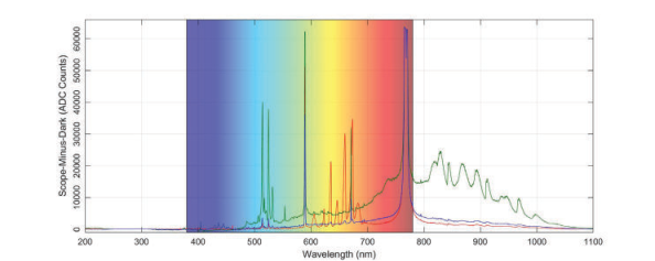 圖5:紅色煙花(紅色線),綠色煙花(綠色線)和藍(lán)色煙花(藍(lán)色線)樣品的光譜