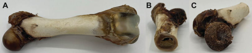 圖1:(A)本實(shí)驗(yàn)所用的骨樣品:寵物店售賣的火腿骨樣品,將其鋸成兩塊。(B):密質(zhì)骨測(cè)量樣品:沿徑向橫截面測(cè)量 (C):松質(zhì)骨樣本:在球關(guān)節(jié)處測(cè)量