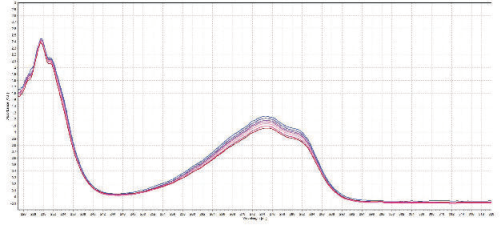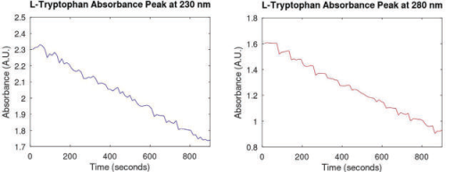 PART02 實驗結果與分析 兩種氨基酸溶液均出現兩個顯著的吸光度峰。 圖3:L-酪氨酸溶液在稀釋過程8分鐘內 的吸光度光譜 L-酪氨酸溶液的吸光度峰在波長230nm和275nm左右(圖3)。 圖4:L-色氨酸溶液在稀釋過程15分鐘內 的吸光度光譜 L-色氨酸溶液的吸光度峰在波長230nm和280nm左右(圖4)。 圖5:測量過程中L-酪氨酸溶液的吸光度 峰值(230nm和275nm)隨時間的變化 圖6:測量過程中L-色氨酸溶液的吸光度 峰值(230nm和280nm)隨時間的變化 正如預期的那樣,稀釋會導致兩種溶液的吸光度峰值下降,其中,L-酪氨酸(圖5)峰值的下降幅度比L-色氨酸(圖6)峰值的下降幅度更小。 PART03 實驗結論 本實驗動態(tài)測量了流動的氨基酸溶液稀釋時的吸光度峰值變化。測量得到的L-酪氨酸和L-色氨酸溶液的吸光度峰值波長與文獻報道中的一致。在整個稀釋操作過程中,峰值的大小都如預期的那樣下降。