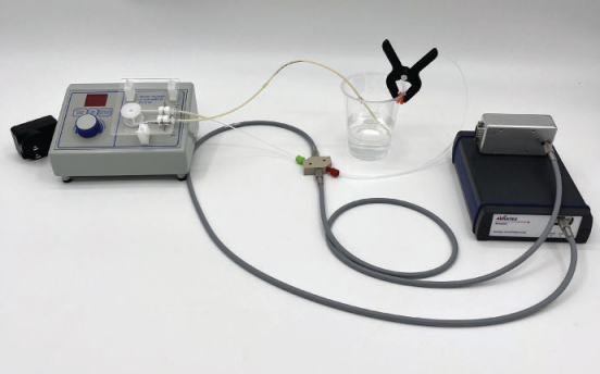 本實驗旨在測量氨基酸在溶液中的吸光度,并在溶液緩慢稀釋的過程中監(jiān)測它們的吸光度峰值變化。如圖一所示,實驗中使用的氨基酸為L-酪氨酸和L-色氨酸,將這兩種氨基酸放于純水(去離子水)中稀釋。為了確保實驗不間斷測量,我們使用了流動樣品池和蠕動泵。 圖1:本實驗測量的氨基酸溶液樣品,包括L-酪氨酸溶液(左)和L-色氨酸溶液(右) 實驗中選擇的氨基酸為L-酪氨酸和L-色氨酸,它們被歸類為芳香族氨基酸。在這種情況下,術語“芳香”不是指氣味,而是指具有平面或接近平面環(huán)狀結構的有機化合物。這些氨基酸通常可以通過獨特的雙鍵來識別。這一組氨基酸的光譜特性很有趣,因為他們不吸收可見光范圍內的光,卻吸收紫外范圍內的光。 實驗中使用流動樣品池和蠕動泵測量。流動樣品池用來將光源和光譜儀固定,使溶液在一定距離之間通過。這種實驗配置適配多種應用,常見的如血液分析。