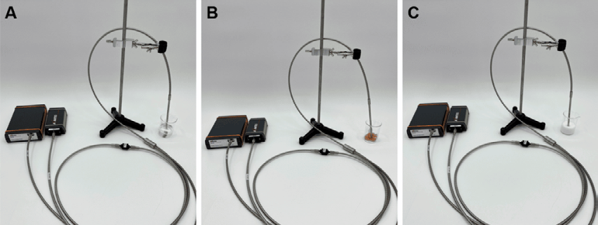 本實驗使用的另一個附件為端部為45度窗口的反射探頭(可以照亮樣品并收集非后向反射信號),一個包含305 nm長通濾光片的支架,以確保只觀察到發(fā)射光譜。我們將稀釋的色氨酸溶液,火雞肉和全脂牛奶這三個樣品分別放置于100ml燒杯中測量。