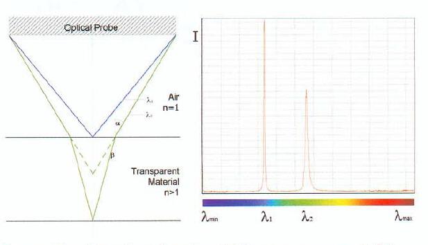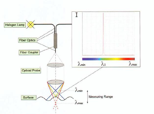 該系統(tǒng)主要由光譜儀、光源和光學(xué)探頭組成;光源通過多模光纖進(jìn)入光學(xué)探頭,光學(xué)探頭將不同波長的光聚焦到透鏡上不同距離處形成色散,同時(shí)在透鏡上下表面不同波長的光形成自垂直產(chǎn)生反射光譜信號進(jìn)入光學(xué)探頭傳輸進(jìn)入光譜儀獲得不同波長的離焦量;然后通過軟件算法計(jì)算得到透鏡的中心厚度。