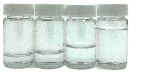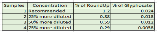 如圖3,農(nóng)達除草劑的稀釋推薦配比為:1.5盎司(3湯匙)農(nóng)達除草劑與1加侖水混合,此時農(nóng)達除草劑樣品的濃度約為1.2%。在溶質(zhì)重量保持不變的情況下,其他三種樣品分別比推薦濃度多稀釋了25%,50%和75%。(此濃度是根據(jù)其他三種濃度確定,這三種樣品的濃度分別比推薦濃度稀釋率高25%、50%和75%。) 圖3:稀釋后農(nóng)達除草劑樣品的濃度和百分比 溶劑是去離子水,用來稀釋草甘膦含量為2%的農(nóng)達溶液,稀釋后得到四種樣品濃度分別為1.2%、0.88%、0.59%和0.29%(圖3)。這四種樣品中草甘膦百分比分別為0.024%、0.018%、0.012%和0.0058%(圖3)。稀釋后的四種樣品如圖4所示。 圖4:稀釋后4種不同濃度的農(nóng)達除草劑溶液