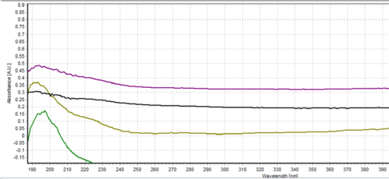 5mm光程探頭測量光譜的一致性不如10mm探頭的測量光譜。樣品2(紫色,稀釋程度增加25%)和樣品4(黑色,稀釋程度增加75%)的光譜形狀與其他兩個樣品不一樣。并且樣品2和樣品4的吸光度譜線達到峰值后并沒有迅速降低,而是并未真正下降。這些結(jié)果證明,5mm光程探頭的測量結(jié)果不如10mm光程探頭的測量結(jié)果可靠。這與我們最初的假設一致:因為四個樣品都被充分稀釋,所以10mm光程探頭可以得到更好的測量結(jié)果。 使用5mm/10mm光程探頭測量 農(nóng)達溶液的吸光度 圖7:使用5mm/10mm光程探頭測量適宜濃度溶液 使用5mm/10mm光程探頭測量 農(nóng)達溶液的吸光度 圖8:使用5mm/10mm光程探頭測量稀釋度增加25%的溶液 使用5mm/10mm光程探頭測量 農(nóng)達溶液的吸光度 圖9:使用5mm/10mm光程探頭測量稀釋度增加50%的溶液 使用5mm/10mm光程探頭測量 農(nóng)達溶液的吸光度 圖10:使用5mm/10mm光程探頭測量稀釋度增加75%的溶液 使用5mm/10mm光程探頭測量 農(nóng)達溶液的吸光度 圖11:使用5mm/10mm光程探頭測量的所有結(jié)果 圖7、8、9和10對比了每個樣品的10mm光程探頭和5mm光程探頭的測試結(jié)果??梢钥吹绞褂?0mm光程探頭的5mm光程探頭的測量結(jié)果更準確。圖11是本實驗的所有光譜結(jié)果匯總。