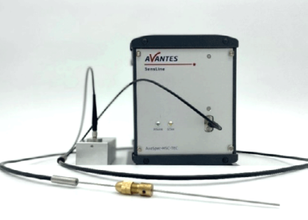 圖1:實驗系統(tǒng) AvaSpec-HERO光譜儀、AvaLight-XE高功率脈沖氙燈和可變光程浸入式探頭 實驗中,我們使用了Avantes公司的科研級紫外/可見光譜儀AvaSpec-HERO(圖1)。AvaSpec-HERO光譜儀基于高靈敏度緊湊型光學平臺(焦距=100mm,數(shù)值孔徑=0.13)以及一塊1024×58 像素的背照式CCD 探測器,它擁有很高靈敏度和分辨率。AvaSpec-HERO采用先進的AS7010電路板,它包括一個高性能AD轉(zhuǎn)換器,具有高信噪比和動態(tài)范圍,USB3.0和以太網(wǎng)接口可以實現(xiàn)高速通信。由于本實驗在紫外范圍內(nèi)需要較高的靈敏度,所以我們使用了這種光譜儀。 光源采用脈沖氙燈AvaLight-XE-HP,它在極紫外區(qū)域有非常好的表現(xiàn),并通過一根Y型觸發(fā)線與光譜儀連接。它接收到光譜儀的TTL信號后開始工作,以確保僅在光源工作時測量光譜。每次測量的閃光次數(shù)可以在AvaSoft軟件中設置,以避免光譜飽和(當過量的光進入光譜儀時會產(chǎn)生飽和現(xiàn)象)。我們在10mm光程長度實驗中將閃光次數(shù)設置為3次,在5mm光程長度實驗中將閃光次數(shù)設置為2次。 圖2 :光程長度為10mm時的可變光程浸入式探頭 實驗系統(tǒng)中的最后一個組件是Avantes公司的可變光程浸入式探頭。Avantes公司為科研及工業(yè)客戶提供了固定或可變光程長度的浸入式探頭 (圖2),光程長度的改變可以通過銅管件的旋松并擰緊實現(xiàn)的。較長的光程長度適用于測量低濃度樣品,較短的光程長度適用于測量高濃度樣品。這是因為更長的距離允許更多的光進入樣品,光程長度為10mm的探頭比5mm長度更適用于較低濃度的樣品。