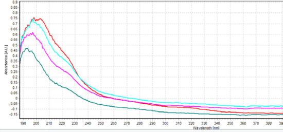 測試樣品前,我們設置光譜儀的積分時間為30ms,AvaLight-XE-HP光源的閃光次數(shù)為3次。我們首先使用10mm光程長度測試了四個樣本,我們選擇吸光度模式,先存儲暗噪聲來消除儀器自帶的噪聲,以溶劑(去離子水)作參考。使用10mm光程長度探頭的吸光度測量結(jié)果如圖5所示。 圖5: 使用10mm光程長度探頭的吸光度測量結(jié)果 純草甘膦的吸光度峰在265 nm左右,而稀釋后的草甘膦吸光度峰可位于200 ~ 300nm的任意波長處。我們在實驗中測得的峰在200nm左右,光譜形狀也與其他研究者的光譜數(shù)據(jù)一致。因此可以證明,使用10mm光程長度的探頭可以很好地測量四種農(nóng)達除草劑稀釋溶液中的草甘膦。 圖6: 使用5mm光程長度探頭的吸光度測量結(jié) 第二次實驗使用的是5mm光程長度探頭,我們設置光譜儀的積分時間為20ms,AvaLight-XE-HP光源的閃光次數(shù)為2次,這樣做是為了避免出現(xiàn)飽和情況,測量結(jié)果如圖6.